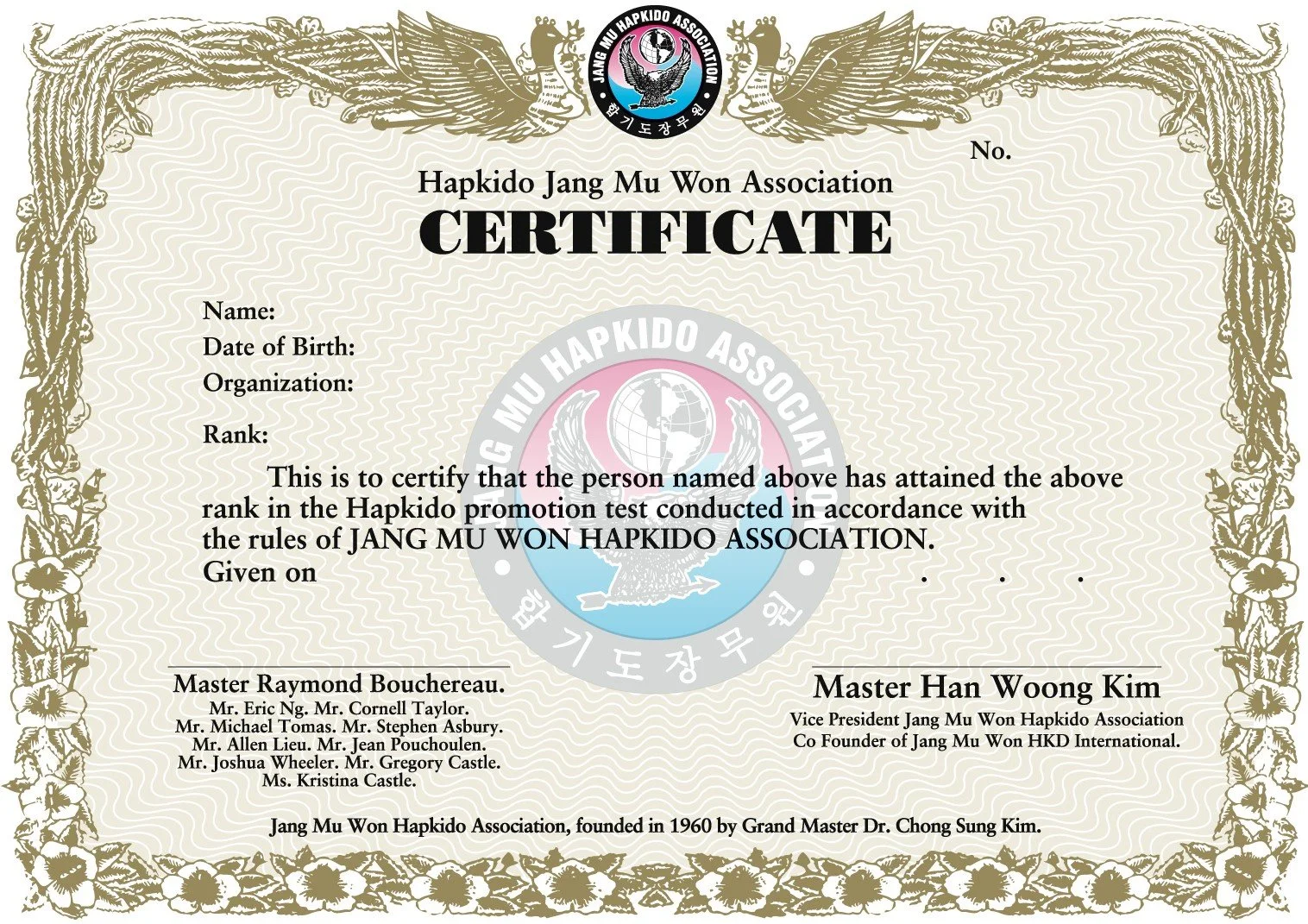 After passing the examination, tester will receive official rank certificate signed by Jang Mu Won International designated instructor and/or master.