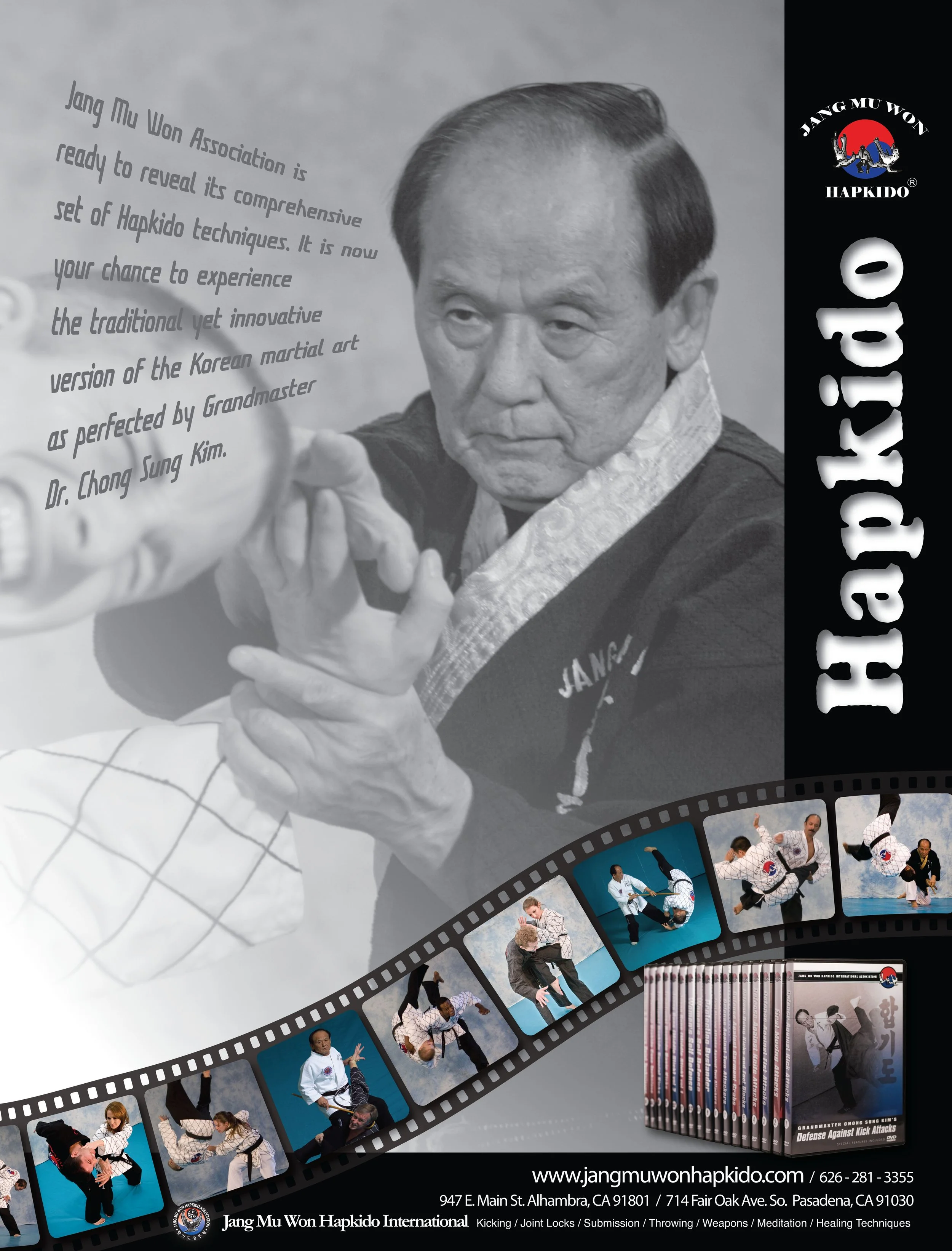 Jang Mu Won Hapkido is a traditional Korean martial art that was founded by Grandmaster Chong Sung Kim in 1960 and brought to the United States in 1973. Jang Mu Won is a refined and diverse form of Hapkido, emphasizing defensive hand and foot strikes, throws, joint locks and includes the use of traditional Korean Weaponry. Grandmaster Chong Sung Kim (김 종성) has developed a comprehensive system of self-defense from thousands of techniques learned over several decades. His dynamic version of traditional Hapkido is ideal for students of all ages and levels of experience in martial arts. Students benefit not only physically, but are simultaneously enriched by the philosophical principles that form the basis of this unique art. Three principles, water, circle, and harmony, are emphasized throughout training. From beginner to advanced levels, these three principles guide a student’s study of Hapkido techniques.